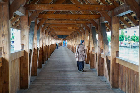 LUCERNE, SWITZERLAND - JUNE 13, 2016: Unidentified woman passing thru wooden famous bridge in Lucerne during daytime