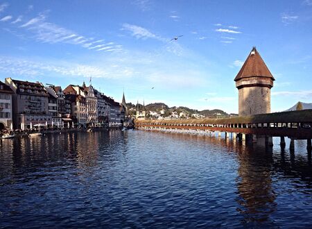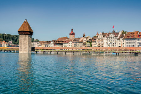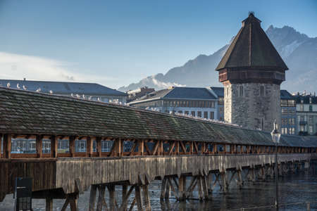 Cityscape view on the famous wooden bridge and tower on Reuss river in Lucerne old town in Switzerland