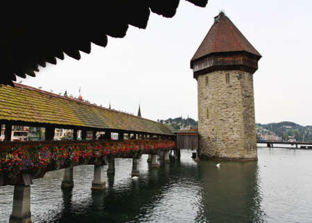 Wooden Chapel Bridge of Lucerne in Switzerland with tower