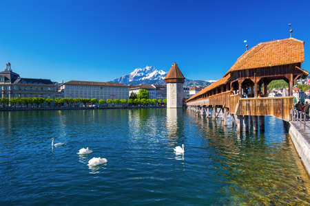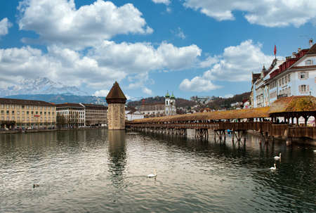 LUZERN, SWITZERLAND - APRIL 11:Chapel bridge famous place on lake Luzern with snow mountain behide, APRIL 11,2015, Lucerne, Switzerland. Chapel bridge famous place on lake Lucerne Switzerland, Europe.