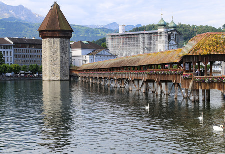 LUCERNE, SWITZERLAND - MAY 05, 2016: View towards Chapel Bridge (Kapellbruecke) together with the octagonal tall tower (Wasserturm) it is one of the Lucerne's most famous tourists attraction