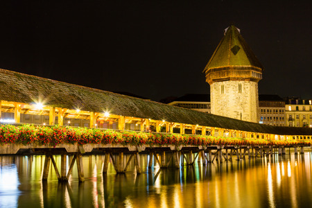 Kapellbrücke, medieval bridge in Luzern at night. The bridge is illuminated, the lights are reflected in the lake. Impressive view of the city