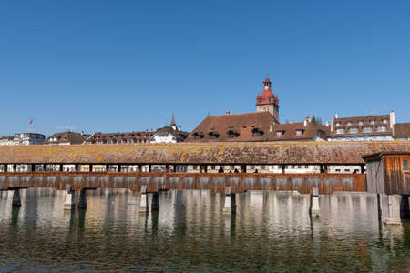 Lucerne, Switzerland, March 10, 2022 Famous old and historic chapel bridge across the river Reuss as well on the lake of Lucerne on a sunny day