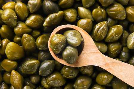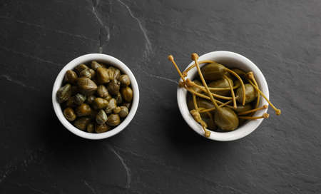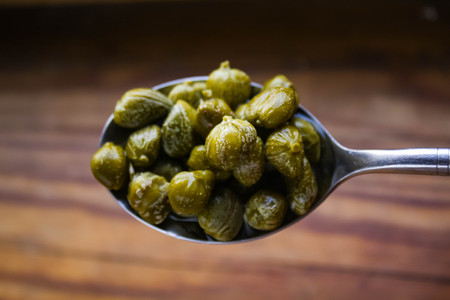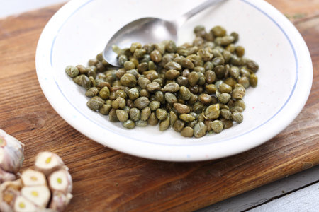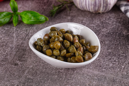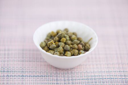 Marinated caper buds, small salted capparis in bowl, fermented food, pickled capers