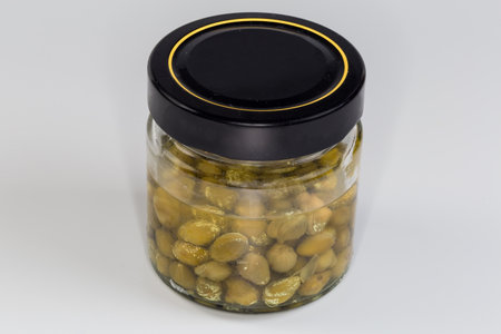 Pickled capers in small jar closed with black lid on a gray background close-up