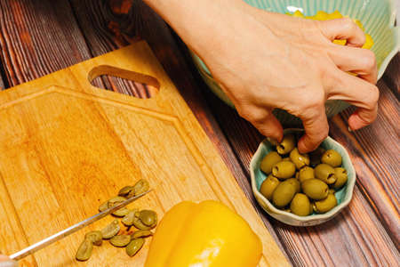 Woman cutting green olives and yellow bell pepper for salad cooking on cutting board on wooden kitchen table. Home culinary concept.