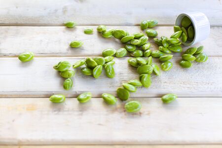 A pile of pumpkin seeds on a wooden table. The seeds are scattered in various sizes and shapes, creating a visually interesting and colorful scene. Concept of abundance and natural beauty