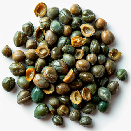 Pickled capers covered with crystallized white spots of rutin on a saucer, top view on a black background