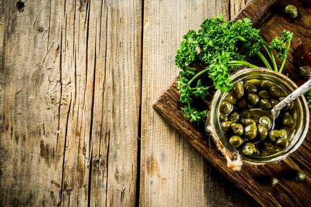 Pickled capers in little jar, with herbs on rustic wooden background copy space