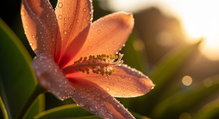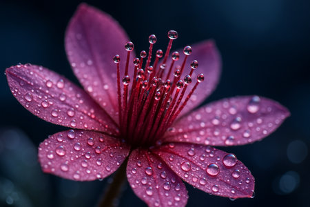 AI generated hyper detailed macro of pink purple flower with sparkling water droplets sharp petals vivid stamen soft blue background romantic fresh nature beauty