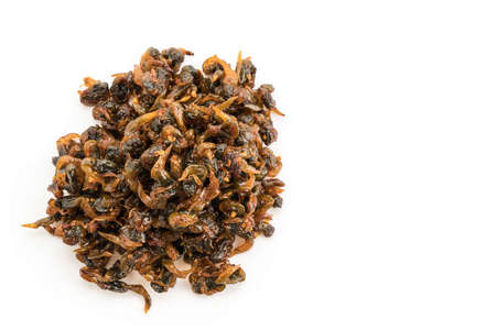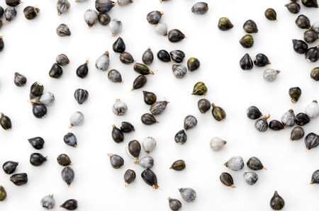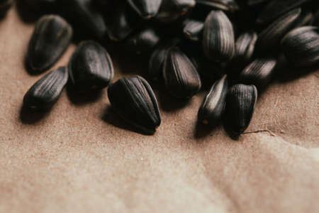 black sunflower seeds isolated on white background with copy space for text, top view of pile of roasted unpeeled seeds