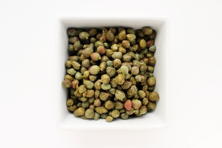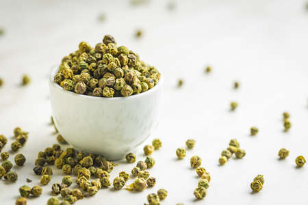 Dried green peppercorn. Dry green pepper spice in bowl on a white table.