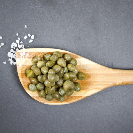 Delicious pickled capers, salt and rosemary twigs on gray marble board