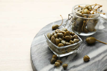 Canned capers in wooden dish on trendy concrete background. Top view.