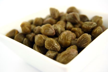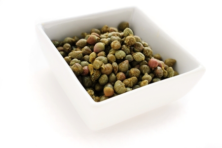 Marinated capers in a ceramic bowl. Edible flower buds of Capparis spinosa, caper bush or Flinders rose on a light background.
