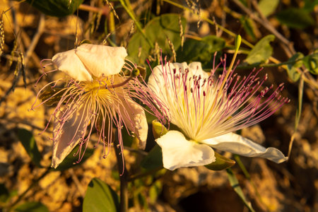 Close-up of the flower of the Caper plant, Capparis spinosa, at sunset. Island of Mallorca, Spain
