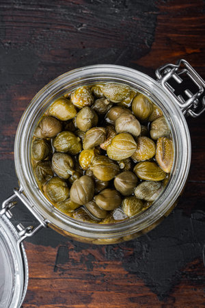 Baby capers in marinate glass jar, on dark wooden background, top view
