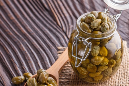 Capers Marinated capers in a jar on wooden background. place for text. Delicious ingredients for cooking. Pickled capers. Canned capers.