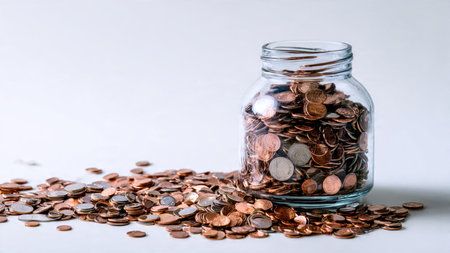 A captivating image of a glass jar brimming with coins with more coins in the air above This visual evokes themes of wealth savings prosperity and abundance