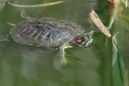 A domestic red-eared turtle in an aquarium, sticking its head out from under the surface of the water. Pets in the aquarium.