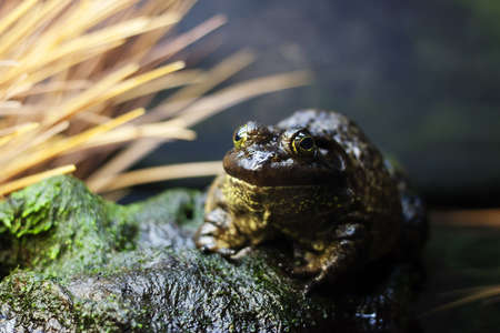 Close up of an Amphibian Toad Reptile sitting on a moldy rock in a rainforest