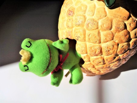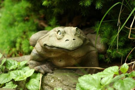 Frog lamp for garden lighting. Ceramic figurine of a frog with halogen lamps in his eyes.