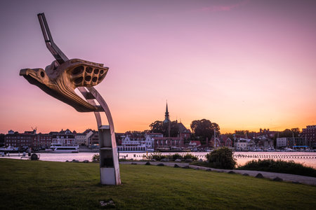 Kappeln, Germany - June 12, 2025: Sculpture Albatros, the figurehead of the sailing training ship Gorch Fock, at the Schlei bridge (Schleibruecke). City of Kappeln in the background. Copy space.