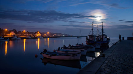 A tranquil harbor scene is depicted at twilight, showcasing several boats moored at a dock. The composition features the moon and soft reflections in the water. The image uses a cool color palette with various lighting from distant structures. It might be suitable for travel, tourism, or serene landscape representations.