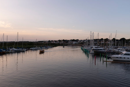 Yachts moored in harbor of riverside town. Panorama view of harbor of Glückstadt on the right bank of the Elbe, Steinburg, Schleswig-Holstein, Germany.