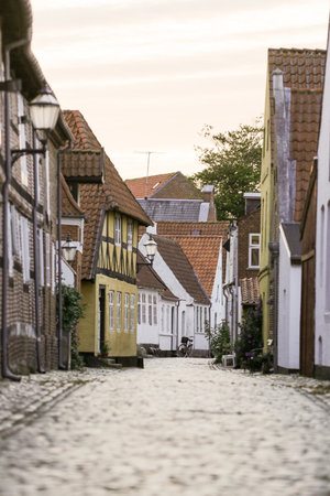 Narrow wooden door between old brick houses with white framed windows with street lamp and stone road in front of them during the autumn afternoon after the rain in the oldest Denmark village Ribe