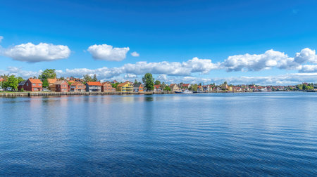 Traditional Scandinavian wooden buildings in vivid colors on Trondheim's waterfront, with the calm sea and blue sky creating a picturesque scene