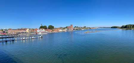 Flensburg, Germany - September 04, 2021: View of the harbor and city of Flensburg, east shore.