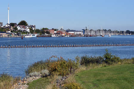 Flensburg, Germany - September 04, 2021: View of the harbor and city of Flensburg, western shore.