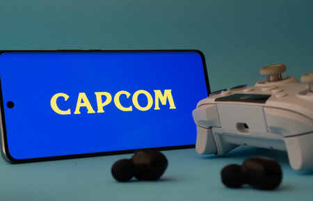 Dhaka, Bangladesh- 19 Sep 2025: A smartphone with a Capcom icon next to a controller and earbuds on a blue surface.