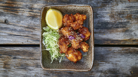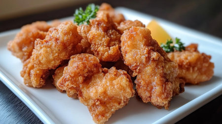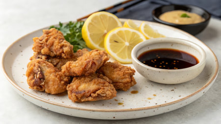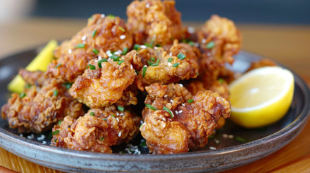 A plate of crispy and flavorful karaage, Japanese-style fried chicken marinated in soy sauce, ginger, and garlic, served with a squeeze of lemon.