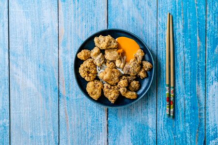 Japanese food deep fried chicken Tori Karaage in a wooden plate isolated on wooden background top view