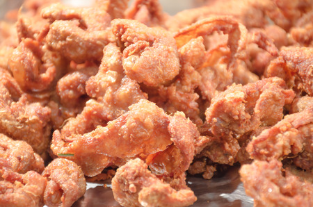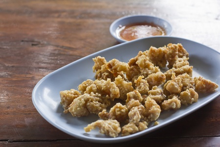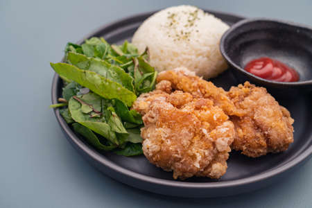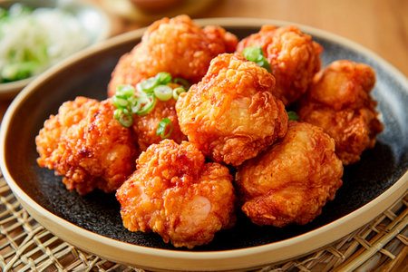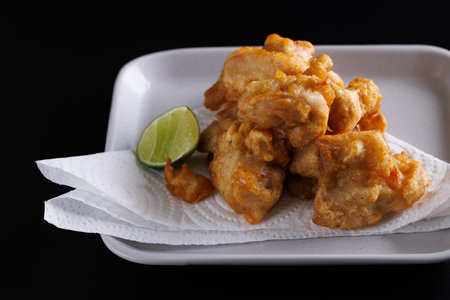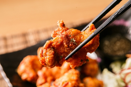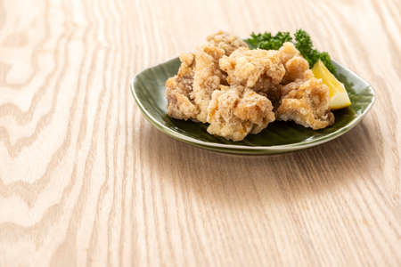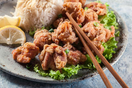Karaage fried chicken, a popular fast food in Japan consisting of battered and deep fried chicken thighs.