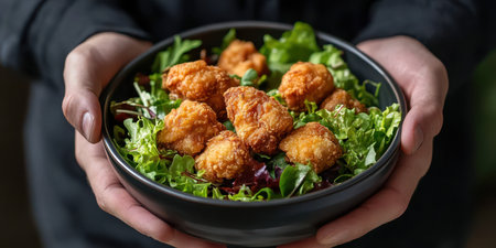 Delicious fried chicken bites served on a fresh bed of mixed greens in a cozy setting