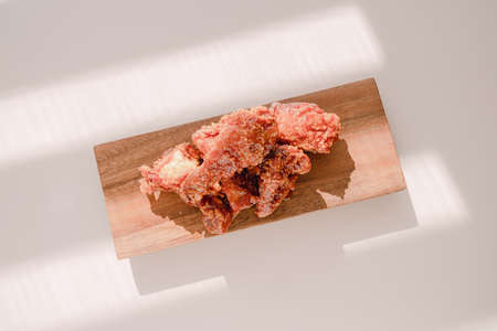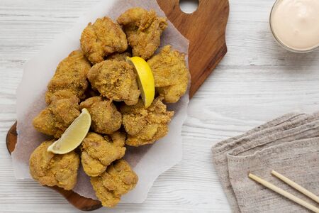 Homemade traditional japanese fried chicken Karaage on a rustic wooden board on a white wooden background. Flat lay, top view, from above. Close-up.