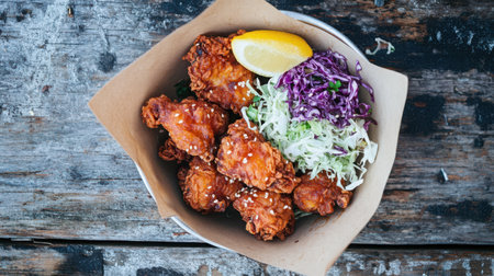 Fried chicken with sauce and lemon on wooden table, vintage style