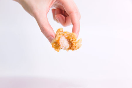 Asian Fried Popcorn Chicken with Taiwanese Seasoning, Handed by Customer on Isolated White Background