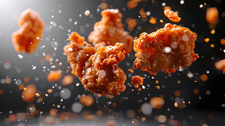 Fried chicken pieces falling from above, golden and crispy, isolated on a black background