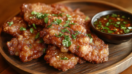 A close-up of golden-brown fried pork ribs served on a rustic wooden plate, garnished with fresh herbs and accompanied by a tangy dipping sauce, capturing the mouthwatering details.