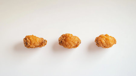A minimalist shot of three perfectly fried chicken wings placed in a row on a white surface, highlighting their uniform golden color against the white background.