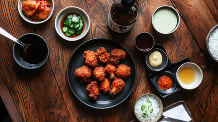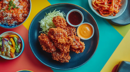 A top-down view of a vibrant table set with crispy Korean fried chicken, side dishes, and dipping sauces, creating a colorful and appetizing atmosphere for enjoying the meal.