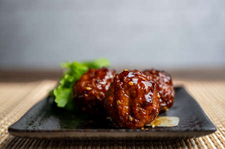 Chilli Chicken is a sweet, spicy and crispy appetizer, most popular in Indo-chinese cuisine, served on a plate. selective focus