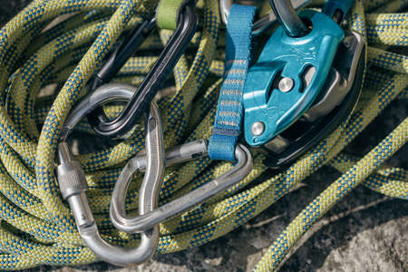 Rock climbing gear with carabiners and rope on rocky surface. Concept of outdoor adventure, mountaineering, safety equipment, extreme sport.