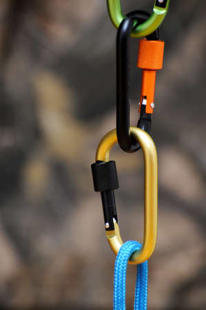 Metal carabine for mountaineering. Photo of colored carabines. Climbing concept