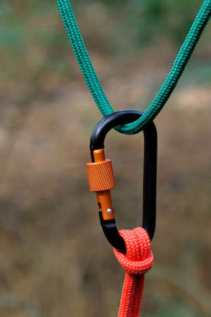 Carabiner with rope on nature background. Climbing uquipment.Climbing sports image of a carabiner on a rope.