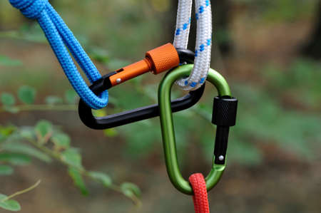 climbing carabiner holds the ropes are red and green